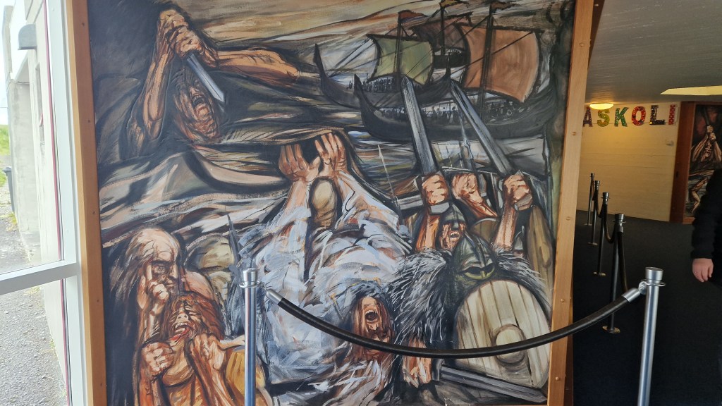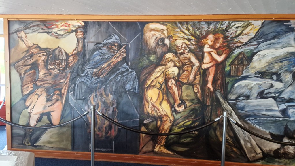 Eine weitere Sache gab es gestern und heute dann doch noch. Das Hotel in dem wir geschlafen haben, ist eigentlich ein Internat mit Schwerpunkt auf Kunst. Im Foyers gab es dazu passend ein etwas düsteres Vikinger Bild.