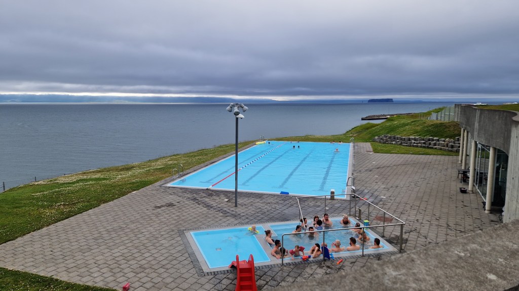 Unser Abendquartier beziehen wir in Hofsos. Ein super kleiner Ort, der für eine einzige Sache bekannt ist. Es gibt hier ein Freibad. Die Becken sind in den Felsen gehauen und bieten einen unglaublichen Blick auf das Meer.