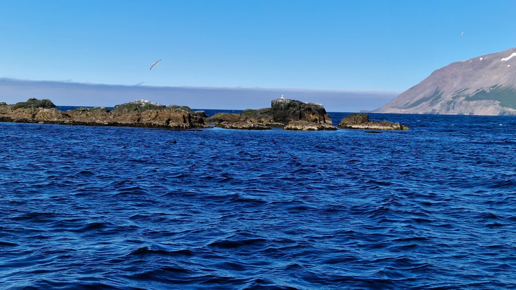 Wir sind schon ganz aus dem Häuschen, weil wir einen Wal gesehen haben. Danach geht es weiter zu einer sehr kleinen Insel voll mit Vögeln, auf denen auch drei Robben leben sollen. Zwei davon begrüßen uns schon aus dem Wasser als wir da angekommen sind. Die scheinen aber gerade keinen Bock zu haben und tauchen wieder unter.