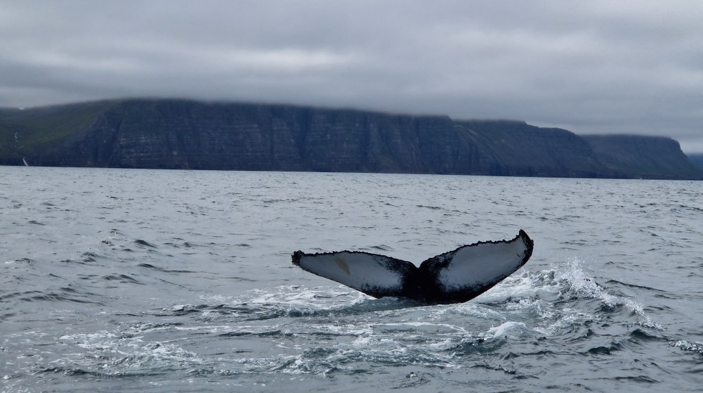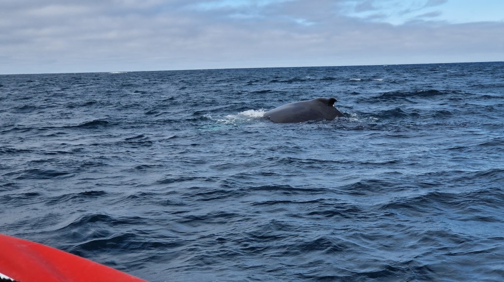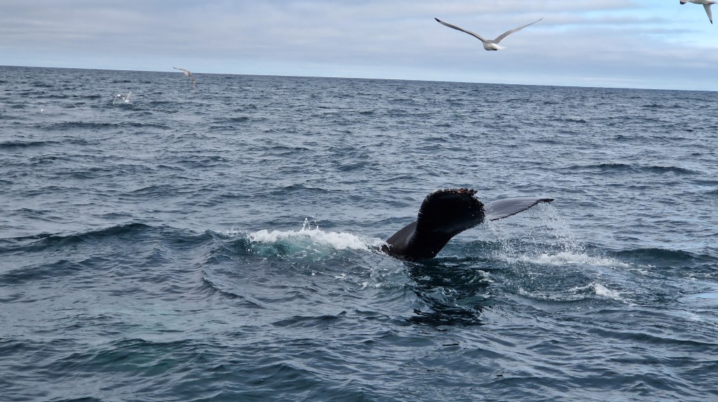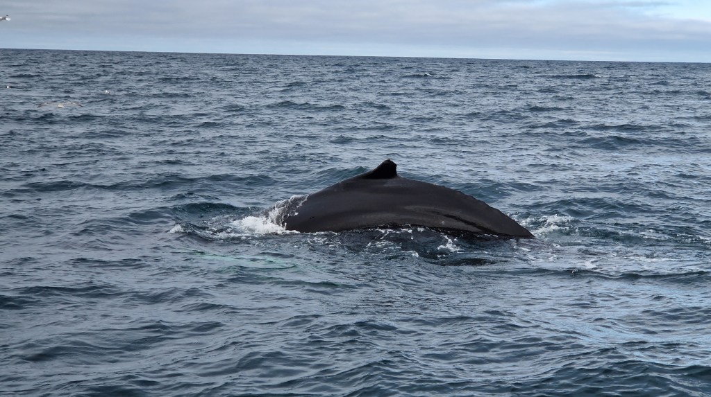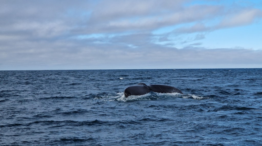 Danach wieder Wal… und mehr Wal… außerdem sehen wir in der Ferne wie zweimal ein Wal (oder zwei unterschiedliche) aus dem Meer springen (also nicht komplett) und mit der Seite wieder ins Wasser klatschen. Ein großartiger Moment, den wir aber nicht auf Foto oder Video bekommen. Wir hatten den Eindruck knapp neben dem Spektakel zu sein.