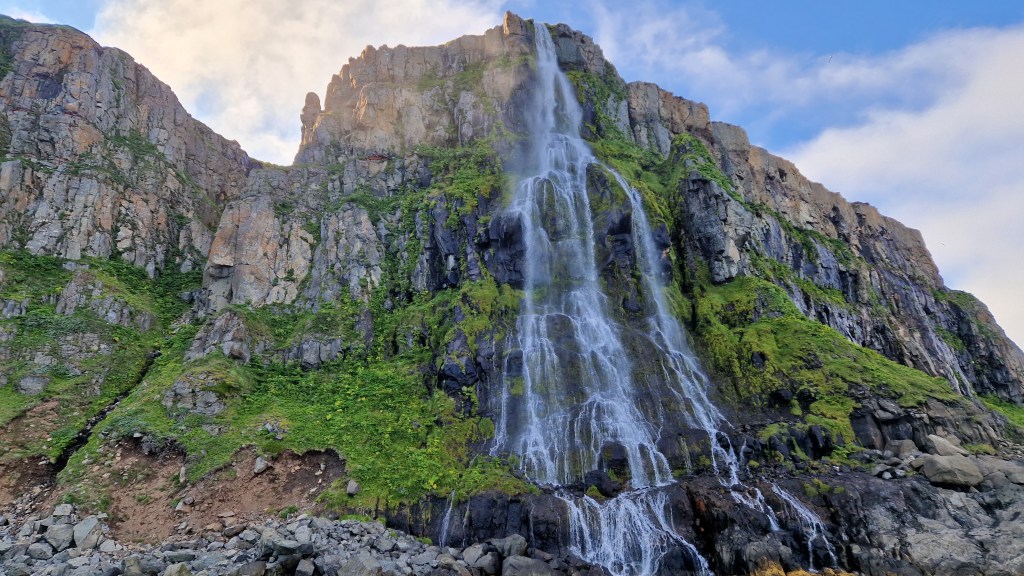 Danach geht es auf den Rückweg. Vorbei an dieser malerischen Küste direkt zu einem der wohl schönsten Wasserfälle die ich hier gesehen habe. Es ist außer uns niemand da, es gibt keine Fliegen die nerven und dazu ist der Wasserfall extrem schön und verspielt.