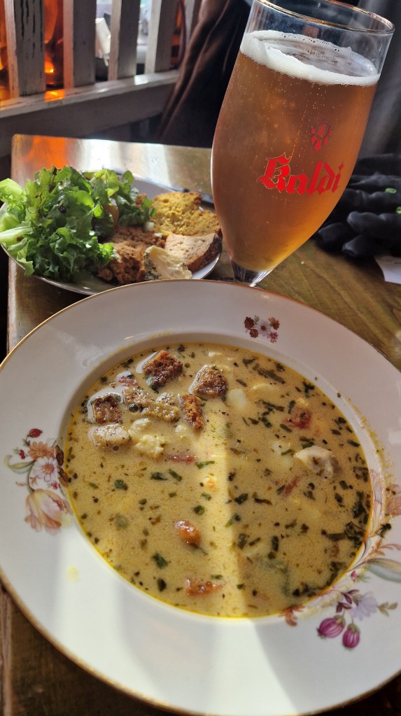 Zum Abendessen gönnen wir uns eine kleine Kneipe, die mit frischem Brot und Fischsuppe lockt. Dazu ein Bierchen und der Abend ist komplett.