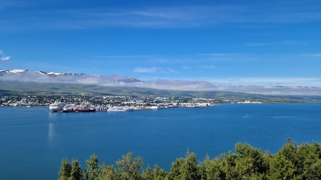 Wir fahren nur durch, also bleibt uns dieser Geruch nicht lange erhalten. Auf der anderen Seite den Berg rauf machen wir einen kurzen Stopp um ein Foto von Akureyri zu bekommen. Von hier, mit dem Panorama dahinter, sieht der Ort ganz nett aus.