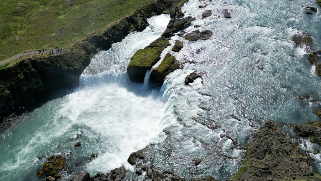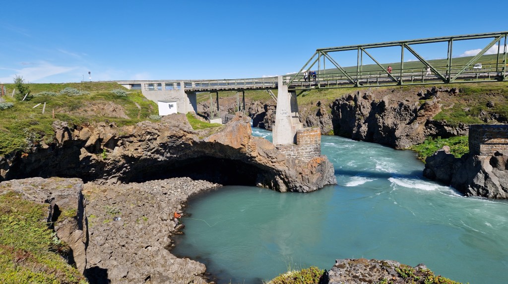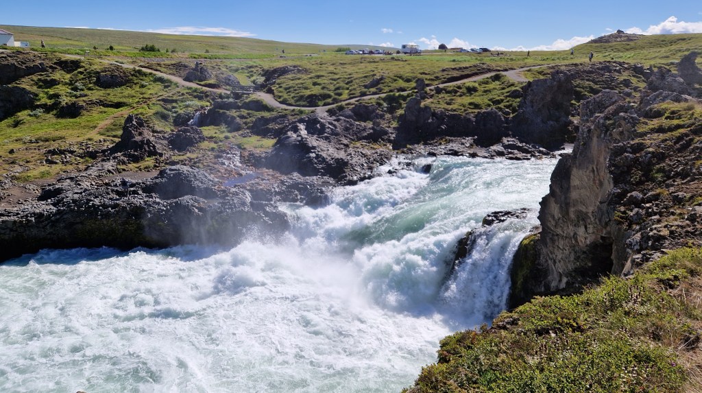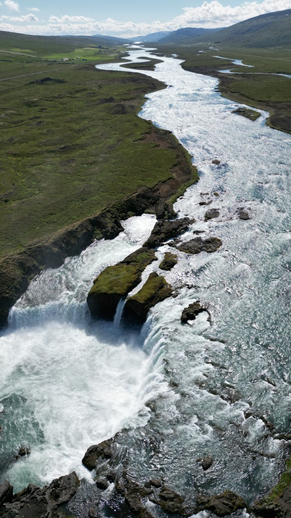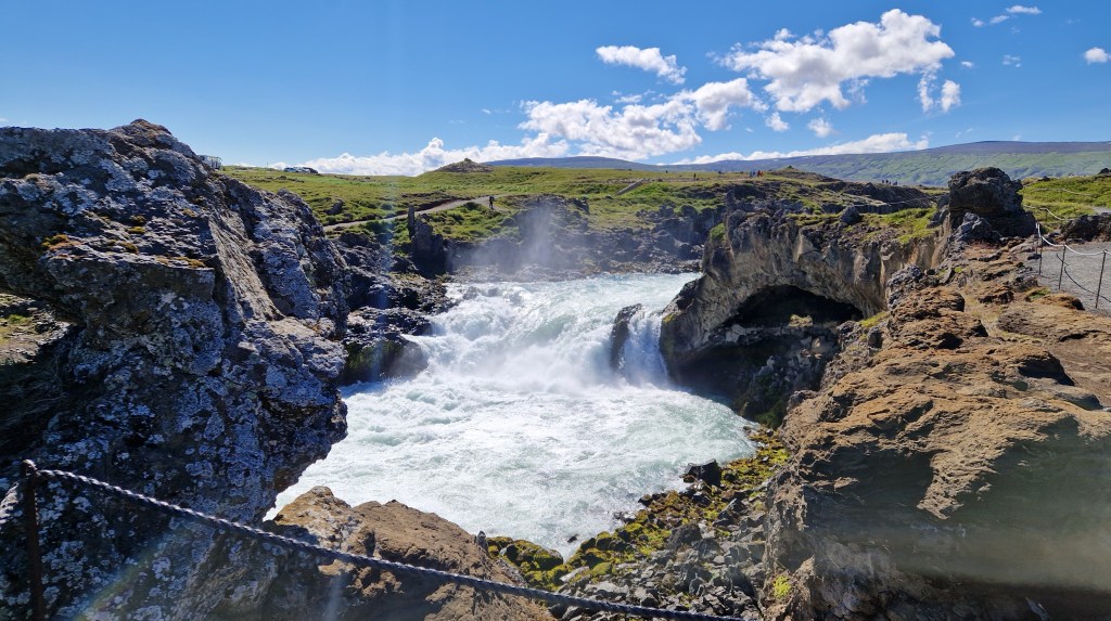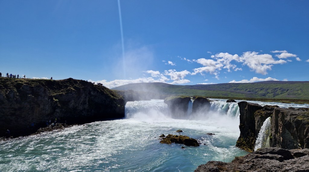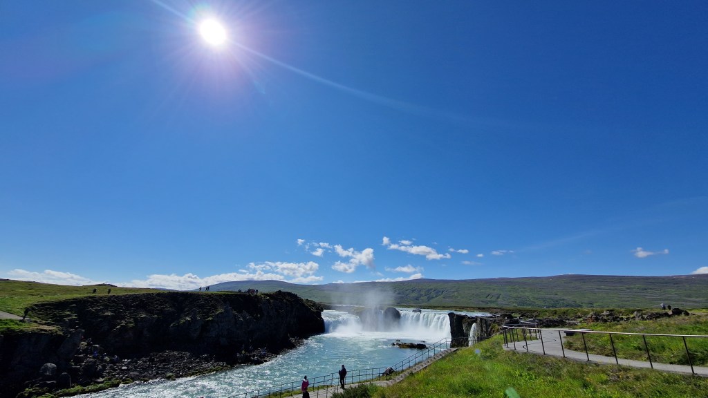 Nächster Stopp ist der Goðafoss. Das Wetter ist der Oberknaller und es geht ein leichter Wind. Wir verbringen hier fast eine Stunde und erfreuen uns an der Aussicht.
