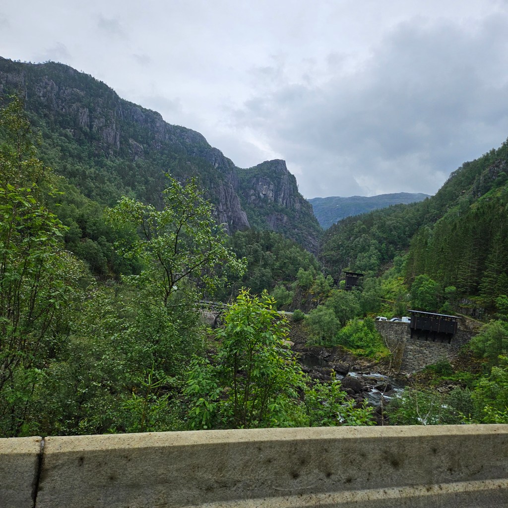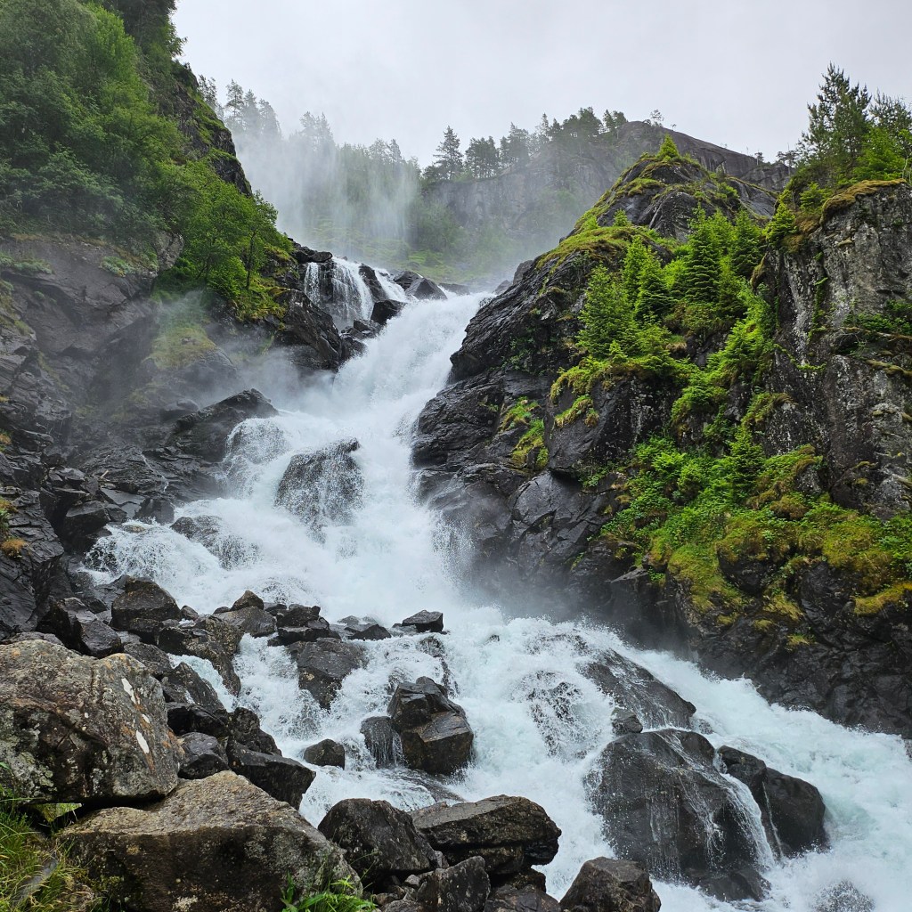 Ab und zu muss ich jemanden durchlassen, aber sonst klappt es gut. Die Aussichten und Landschaften sind unglaublich schön. Irgendwann geht’s wieder runter. Nächster Stopp: Latefossen.