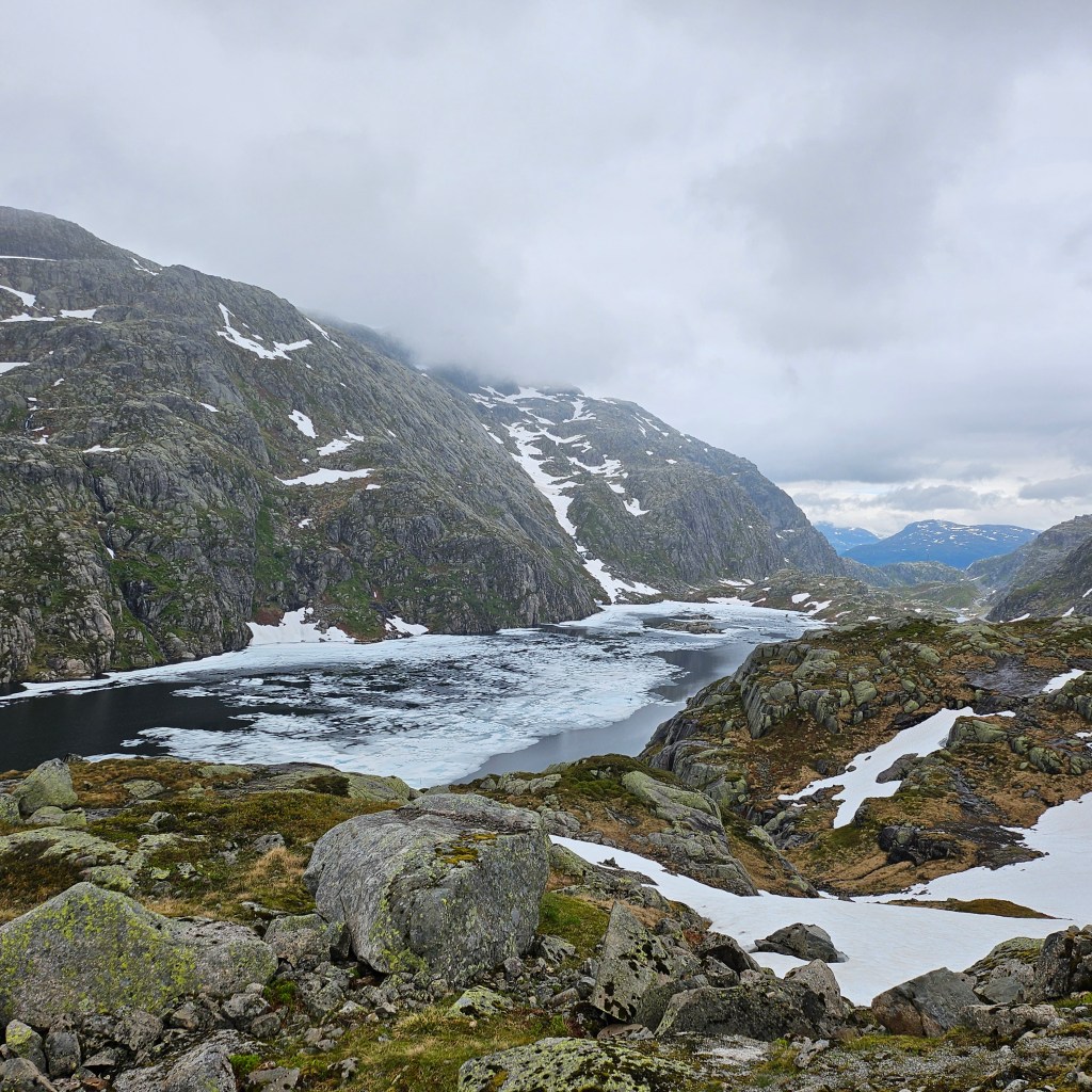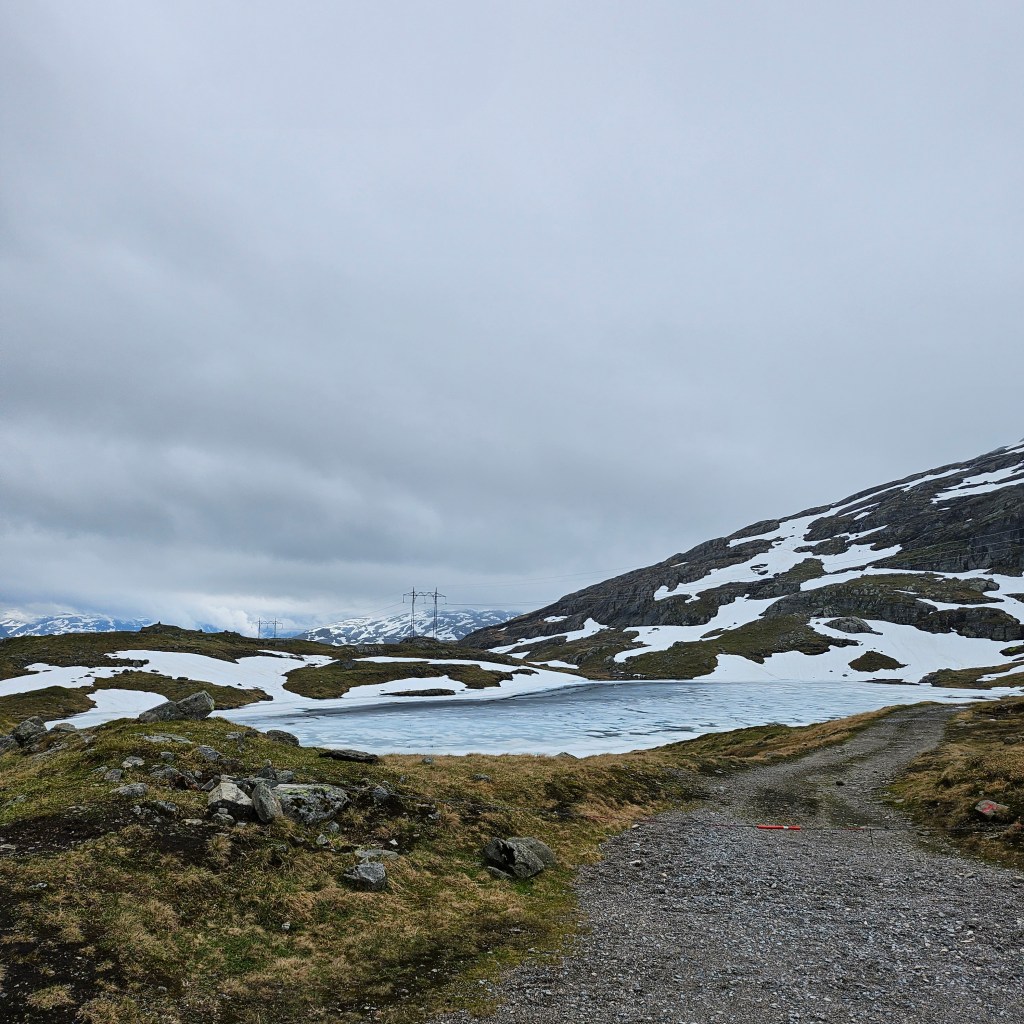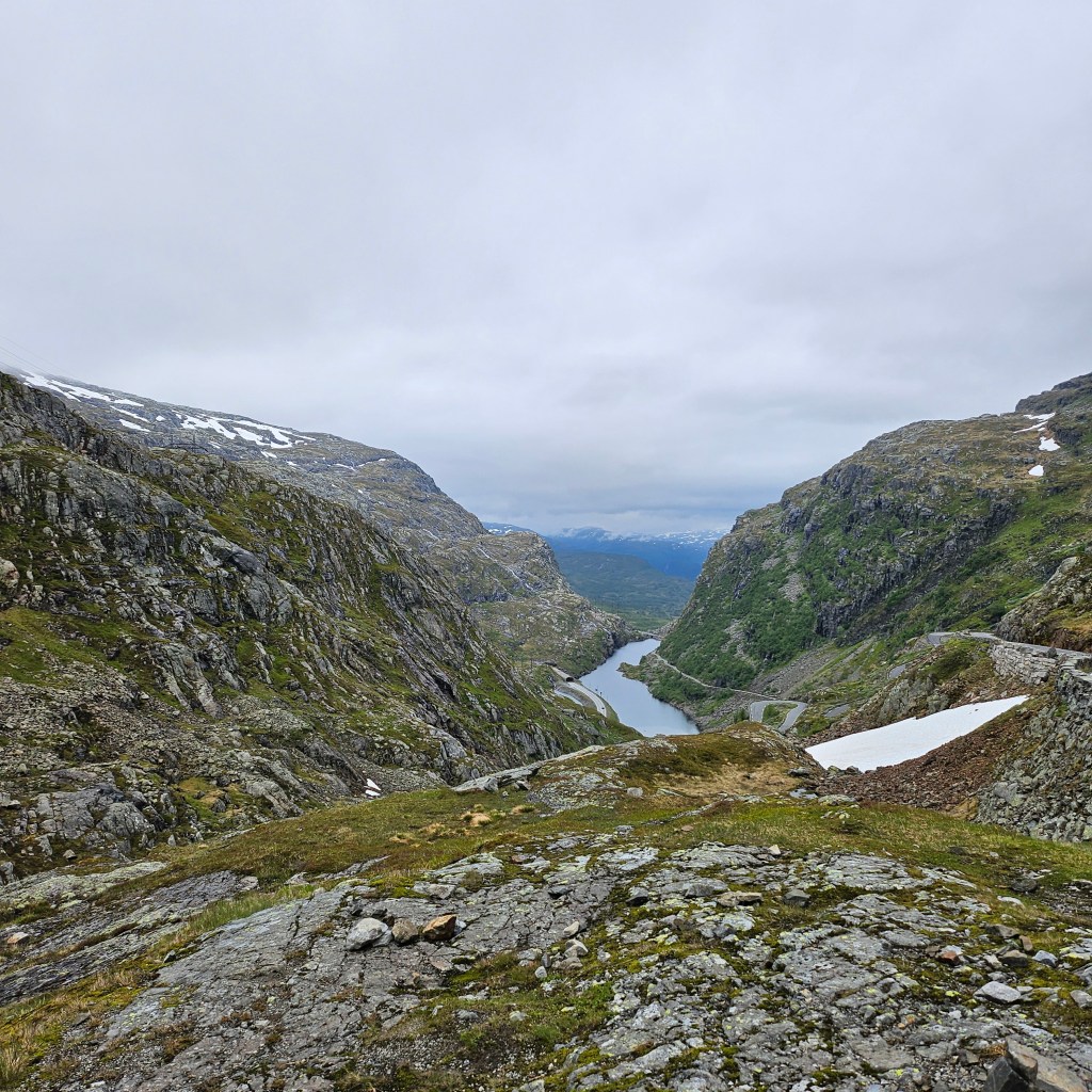Mein Plan ist es, in die Highlands zu kommen, wieder das wilde Norwegen zu erleben. Also fahre ich die 46 und die 520 Richtung Sauda – eine kleine kurvige Straße direkt am Fjord entlang. So schön… bis Gegenverkehr kommt, dann wird es hin und wieder sehr spannend. Von Sauda geht es dann über die 520 so richtig hoch. Ich halte dauernd an, um Fotos zu machen und die Landschaft zu bestaunen. Es ist wieder atemberaubend schön. Der ab und zu einsetzende Nieselregen schreckt mich nicht ab.