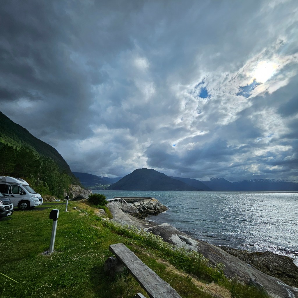 Ich werde wach. Menschen direkt neben meinem Auto unterhalten sich in einer Sprache, die ich nicht kenne… vermutlich Norwegisch. Aber warum stehen sie direkt neben meinem Auto??? Ich schiebe die Verdunklung ein Stück beiseite. Mitnichten stehen sie direkt neben meinem Auto, so ca. 10m davon entfernt… was man sich so alles einbilden kann. Eine Gruppe junger Menschen ist dabei, Paddelboote ins Wasser zu lassen. Ich stehe auf und mache mir erstmal einen Kaffee. Inzwischen weiß ich auch, wohin ich will und wie ich dorthin kommen will. Also alles verstaut, noch schnell abwaschen und los geht’s.