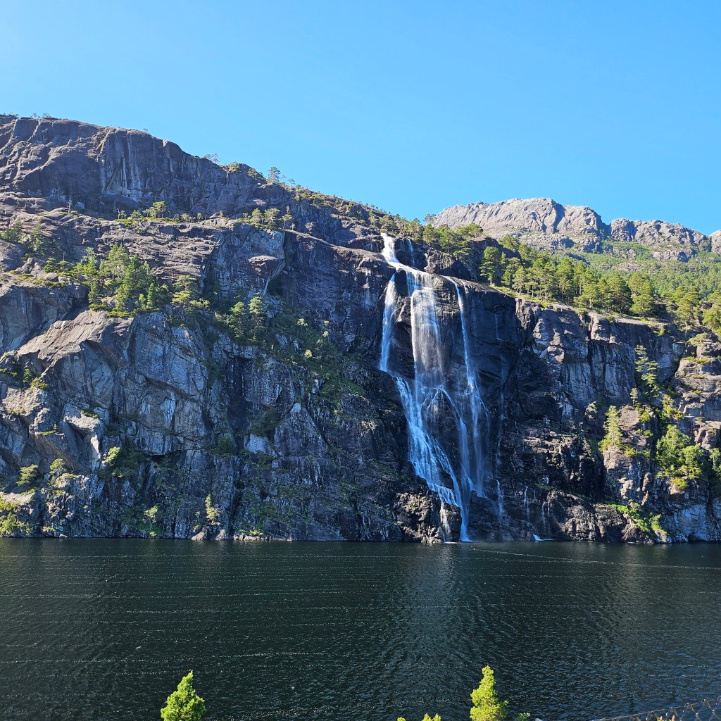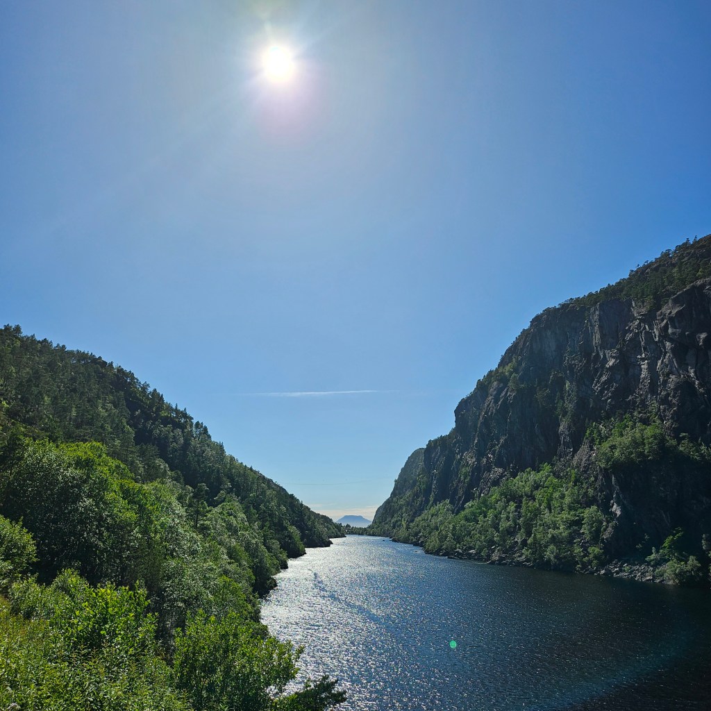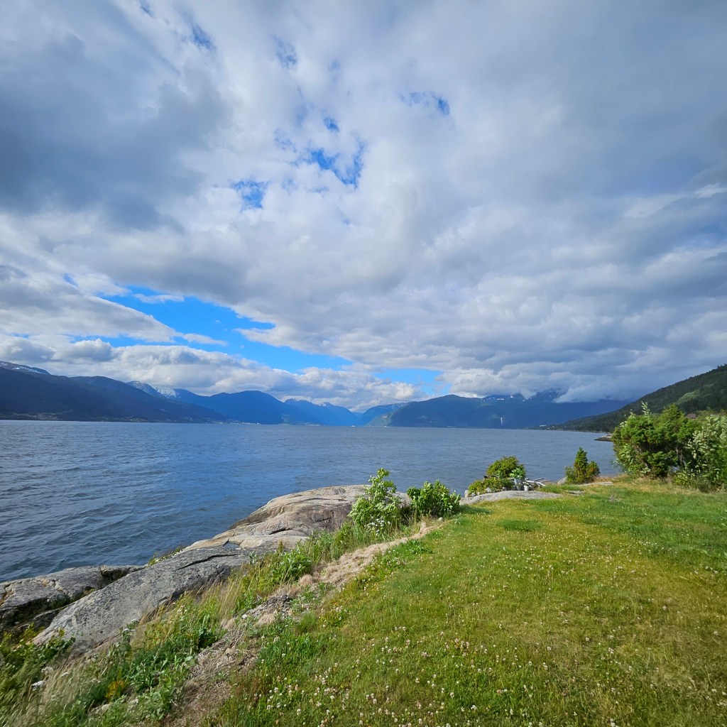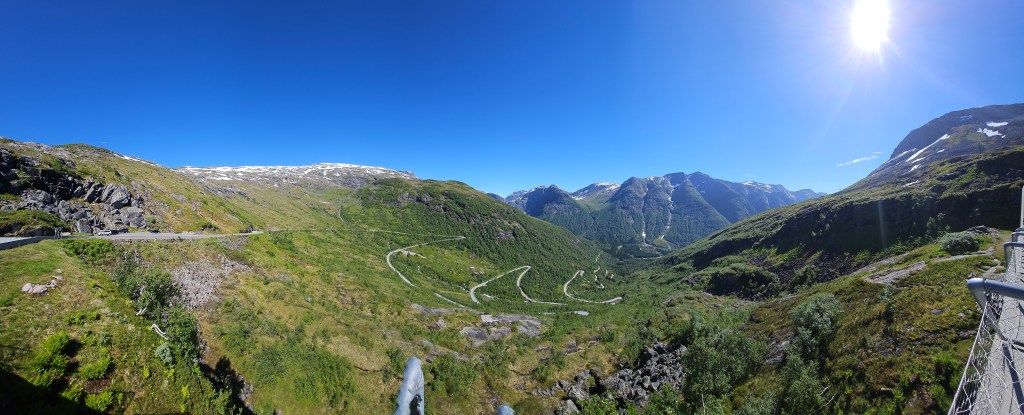 Ich fahre weiter meine Strecke, der Ersatzreifen ist ein vollwertiger Reifen und auch erst 6 Monate alt. Also alles cool…. Ich komme am Gaularfjellet Utsikten vorbei. Eine Aussichtsplattform, die einem einen erhabenen Blick über das Tal gewährt. Von da aus geht es weiter den Berg hinunter bis nach Forde. Die Strecke ist malerisch schön, und ich halte alle paar Meter an, um ein Foto zu machen. In Forde suche ich einen Reifenhändler auf. Vielleicht kann der die Reifen reparieren. Ich bin erstaunt, nach nicht einmal 10 Minuten bin ich mit einem reparierten Reifen wieder draußen und bin 17€ ärmer… ich hatte mit mehr Zeit und mehr Geld gerechnet.