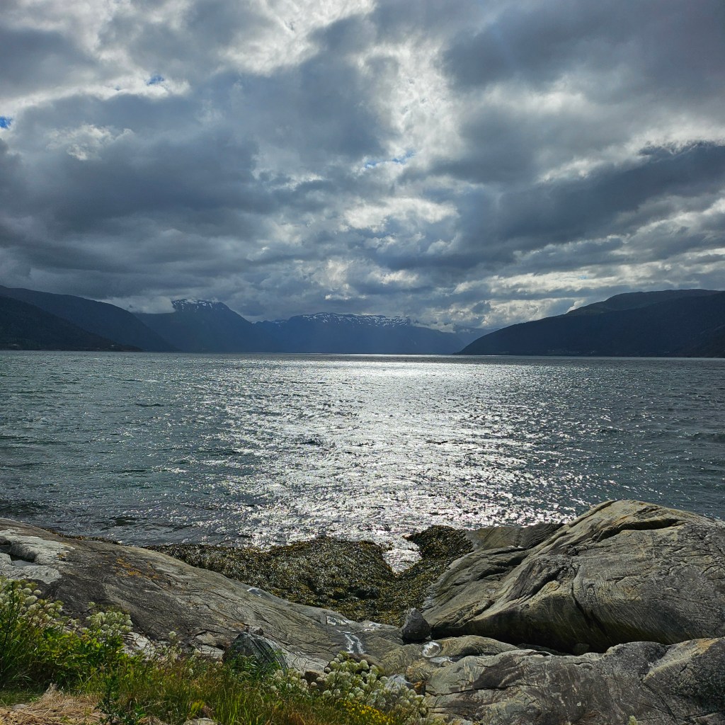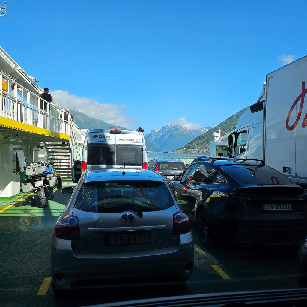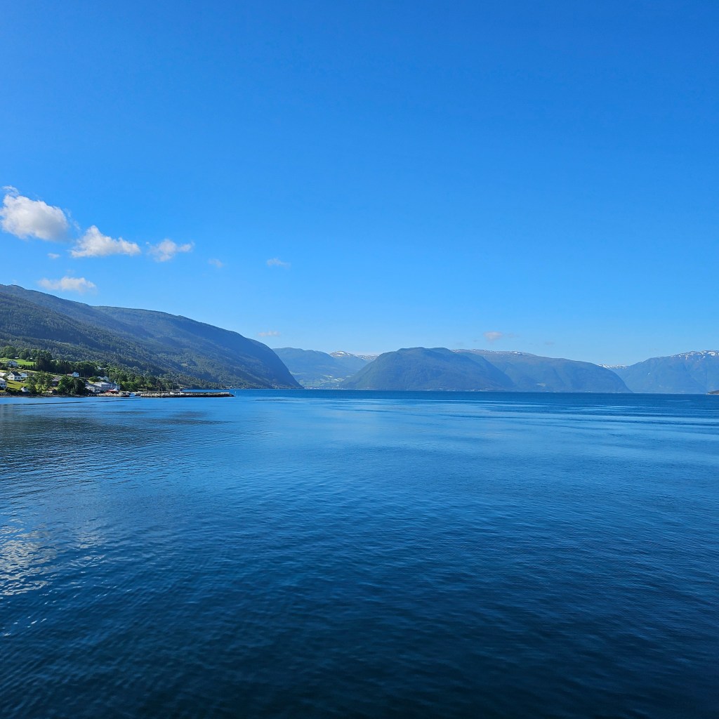 Ca. 1 Stunde vor dem unfreiwilligen Stopp genieße ich einen Kaffee bei einer großartigen Aussicht auf den Sognefjord. Kurz darauf fahre ich los; es geht heute weiter nordwestlich, allerdings weiß ich noch nicht genau, wohin mich der Tag führen wird. Ich nehme eine Fähre, die mich nach Dragsvik bringt. Die Sonne und der blaue Himmel lassen die Fjordlandschaft in allen möglichen Farben erstrahlen. Vor den Bergen zeigt sich das braun/schwarz der mäßig bewachsenen Felslandschaft, durchzogen von weißen Schneeflecken. Weiter unten wird es immer grüner, je näher man der Wasseroberfläche kommt. Das Wasser selbst leuchtet in Ufernähe türkis, und wo es tiefer wird, geht es ins Blaue über. Darüber der Himmel: fast wolkenlos und die Sonne knallt.
