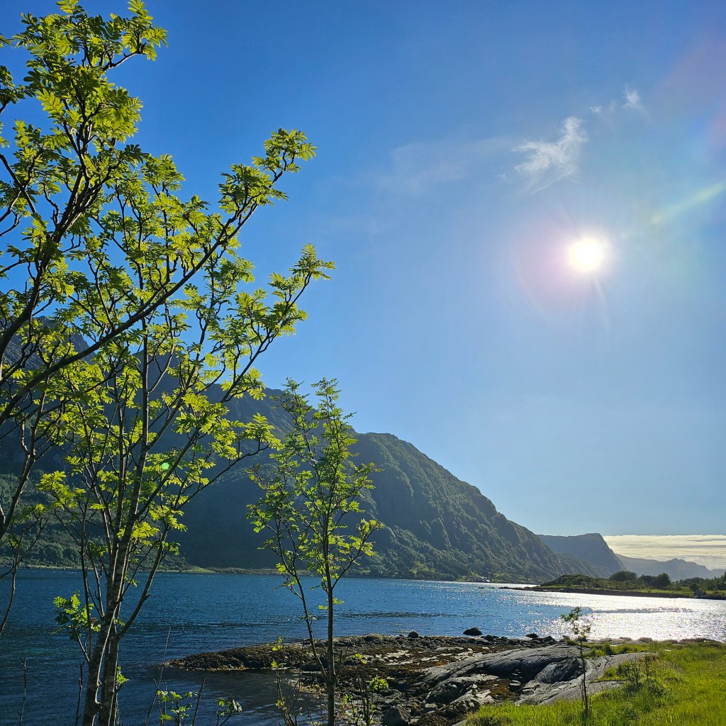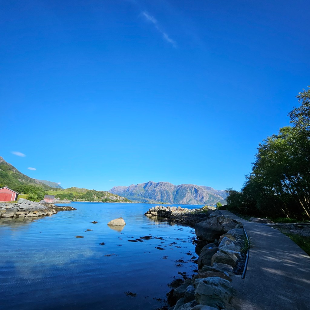 Ich versuche mich zu beeilen, ein bisschen weiter finde ich eine Schotterfläche auf der ich halten kann, die verutlich auch einen Wagenheber trägt… in einer wirklich hübschen Bucht bei Svaegen auf der Fv613 bleibe ich stehen. Jetzt muss es schnell gehen, damit der Reifen und die Felge keinen Schaden nimmt, also nicht mehr als eh schon.