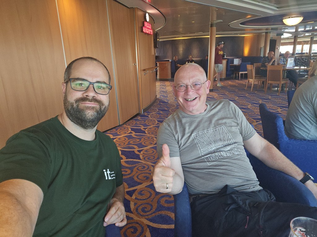 Was willst du denn trinken? frage ich, nachdem ich den Laptop weggelegt habe. Wir gönnen uns noch ein Kaltgetränk in der Bar. Die Aussicht zieht inzwischen an uns vorbei, wir fahren… langsam, aber wir fahren. Beim Verlassen des Hafengebiets in Rotterdam fachsimpeln wir über die Schiffe, die wir am Horizont sehen, beide keine Ahnung und das Internet schwindet. Beste Voraussetzungen für die wildesten Ideen.