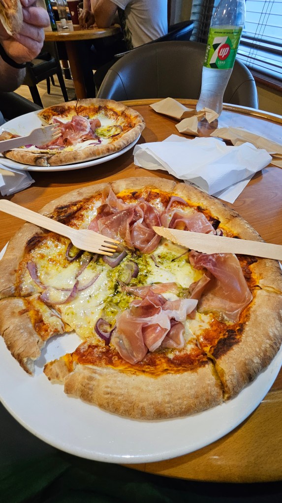 Etwas später gehen wir dann auf die Jagd nach etwas zu essen. Es wird eine Pizza werden. Für ein 30-Pfund-Buffet sind wir nicht hungrig genug und für Ala carte sind wir zu geizig. Also was aus dem Onboard Costa. 15 Pfund für eine Pizza ist schon viel, aber OK in Anbetracht, dass wir auf einem Schiff sind. Irgendwann geht mir der Trouble auf die Nerven und ich entschließe mich, in unsere Luxus-4-m² zurückzuziehen. Ich lege mich ins obere Bett und schaue Quatsch, den ich auf dem Handy gespeichert habe. Kein Internet ist man echt nicht mehr gewohnt.