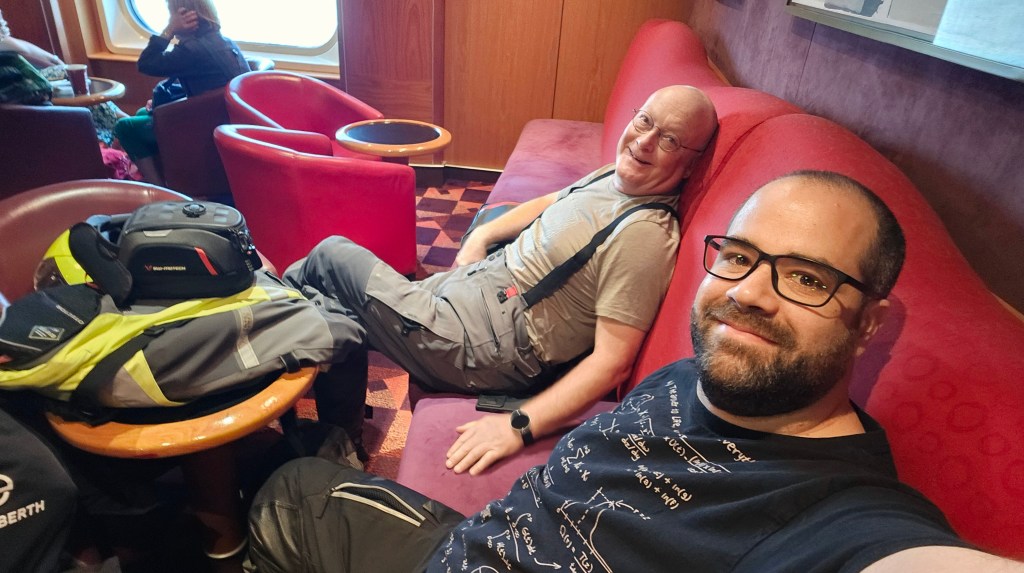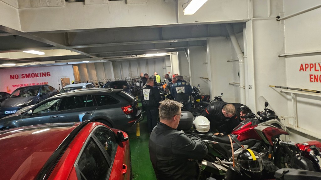 Als das Schiff dann angelegt hatte, durften wir auch irgendwann auf das Autodeck. Was wir bis dahin nicht wussten, wir sind mit einer Horde Lambretta-Fans gereist. Tolle Mofas aus den 60ern und später. Manche bis zur Unkenntlichkeit umgebaut, andere liebevoll restauriert. Aber irgendwie haben die alle den Knall nicht gehört. Kaum auf dem Autodeck machen die ihre Zweitakter an. Schnell wird die Luft von halb verbranntem Zweitaktgemisch verdrängt, es ist ekelhaft. Jede Disco wäre auf diesen Nebel neidisch. Abgesehen vom Gestank ist es auch superlaut….