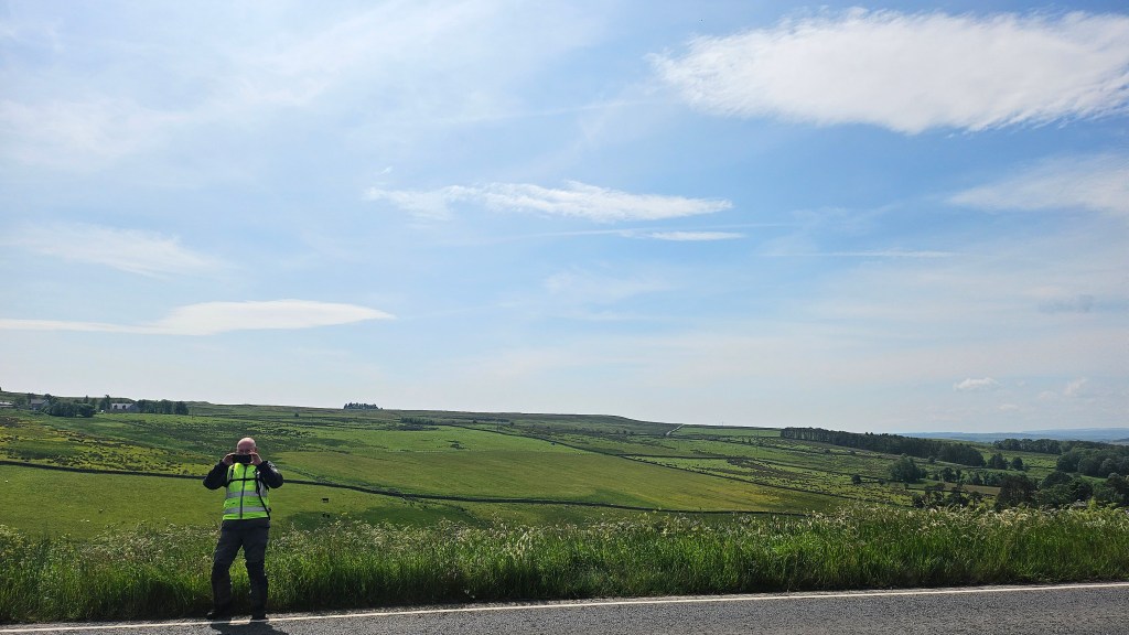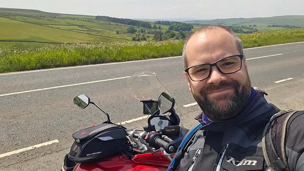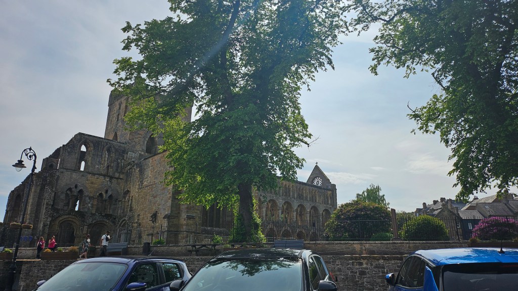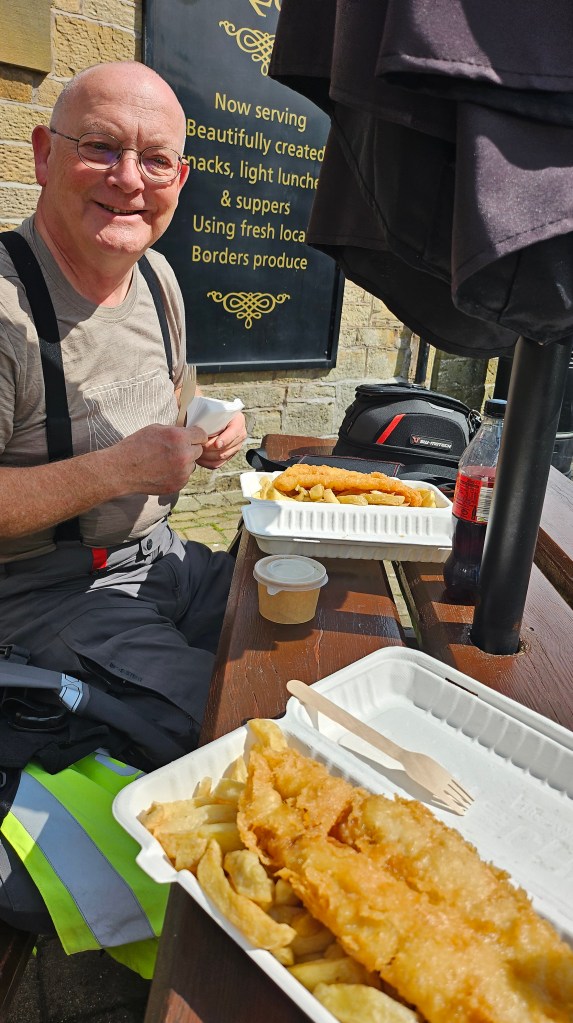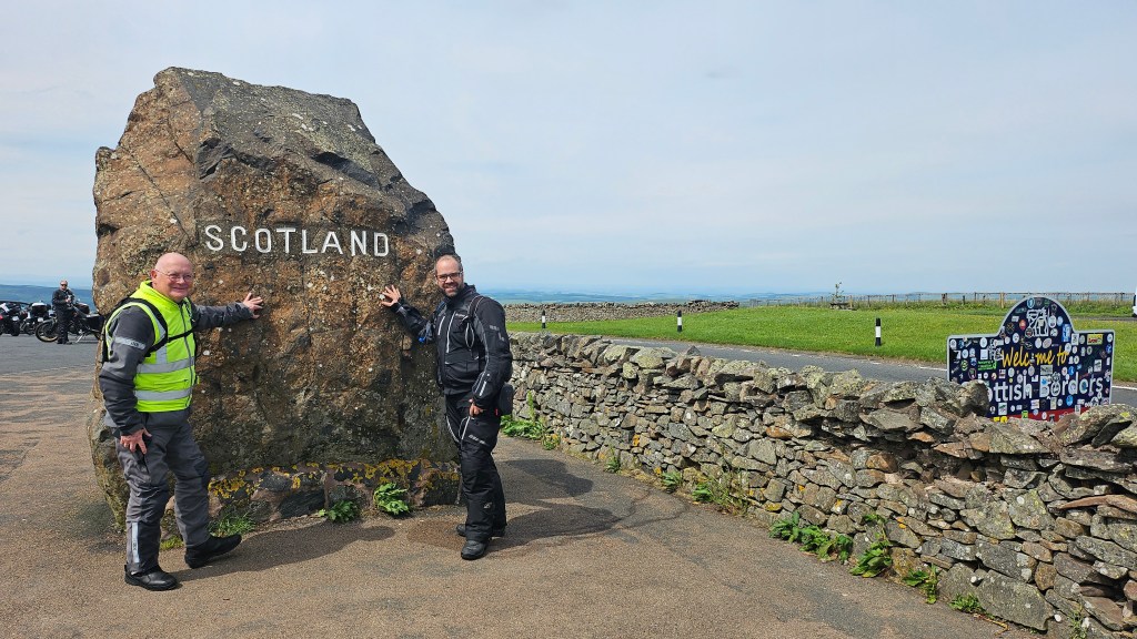 Gü wollte sich nach Möglichkeit eine Kirche bzw. Burg anschauen… die Möglichkeit hat sich nicht ergeben, aber danach wurde die Strecke echt schön. Die A68 ist wirklich eine schöne Straße. Bei bestem Motorradwetter haben wir die Grenze zu Schottland erst erreicht, danach sogar, haltet euch fest, überfahren. Auf dem Weg haben wir noch ein paar Steine in Jedburgh angesehen. Hier stand mal ein Kloster der Augustiner-Mönche. Kommentar von Gü – wusste ich doch, irgendwas mit Bier. 😀