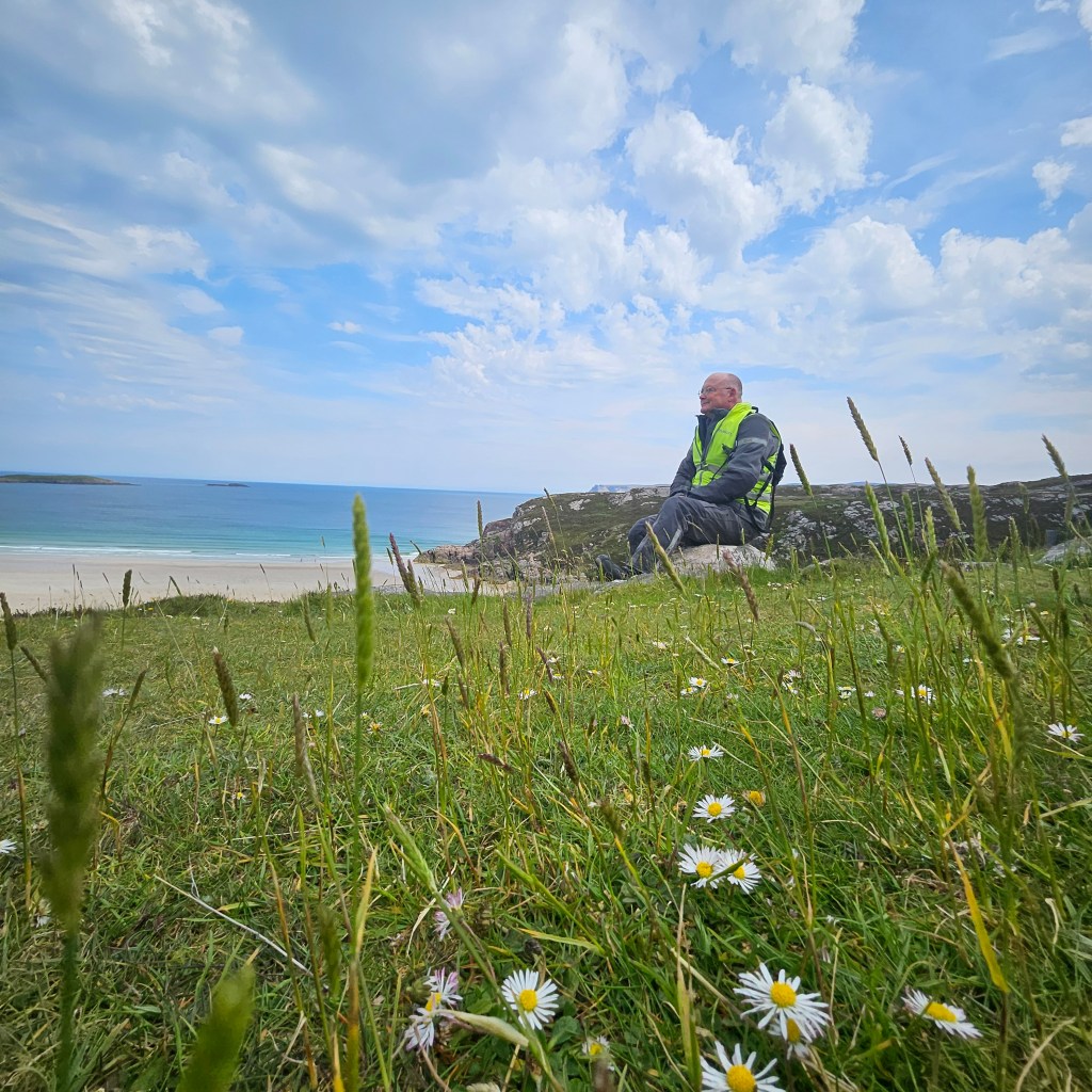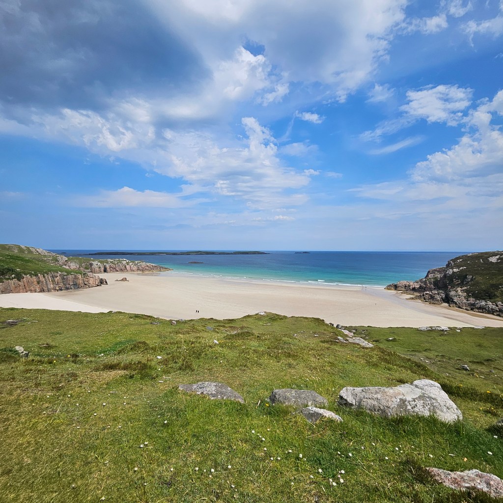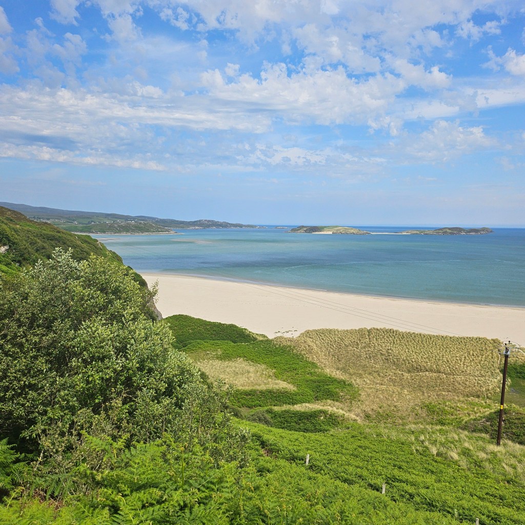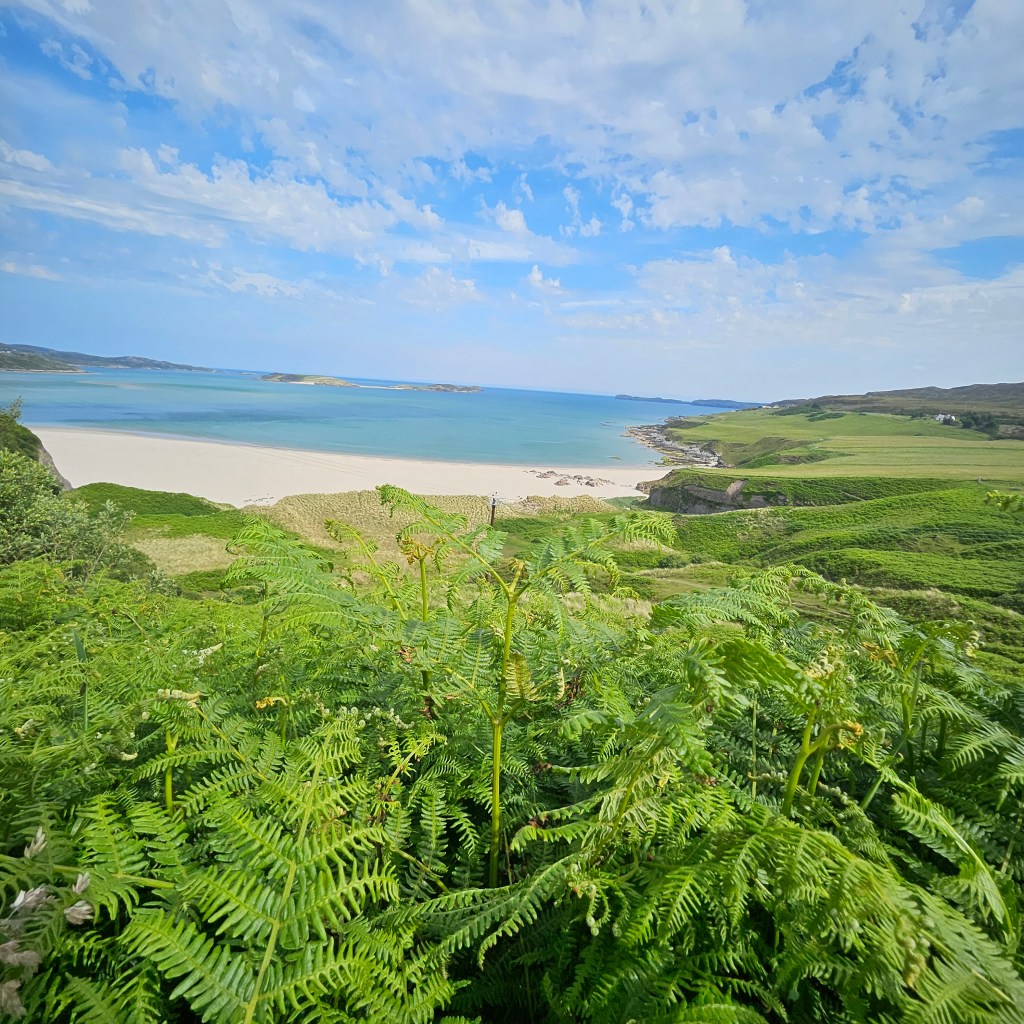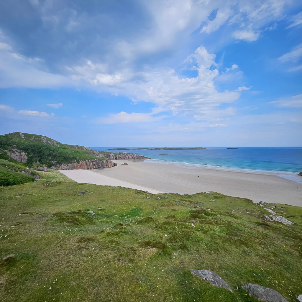 Los geht es bei starkem, böhigem Wind Richtung Westen. Vorbei an einem Kernkraftwerk ohne Kühlturm, keine Ahnung, was das ist, aber es steht Kernkraftwerk dran. Die Schotten machen wohl mehr als ich dachte anders als der Rest der Welt. Irgendwann wird es dann auch hügelig und die Strecke wird kurviger. Von Zeit zu Zeit werde ich wieder an Norwegen erinnert. Diese schroffen, kaum bewachsenen Hänge, die bis ins Meer gehen und dort eintauchen, sind ein sagenhafter Anblick. Dann kommt wieder eine andere Gegend, die mich mehr an das Flachland von Island erinnert, die Teile, auf denen außer Farnen, kleinen Hecken und Gras nichts wächst. Die Landschaft wechselt sich weiter ab. Wir kommen an wunderschönen Sandstränden vorbei. Wenn das Wasser mehr als 10 °C hätte, wäre die Landschaft mit Hotels nur so verschandelt (wie im Süden Europas), hier aber will niemand baden und damit bleibt die Natur an den Hängen der Strände.