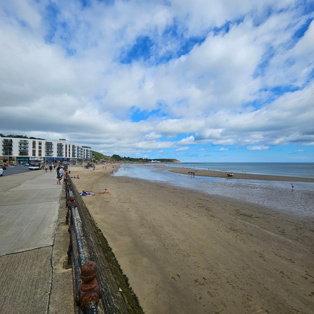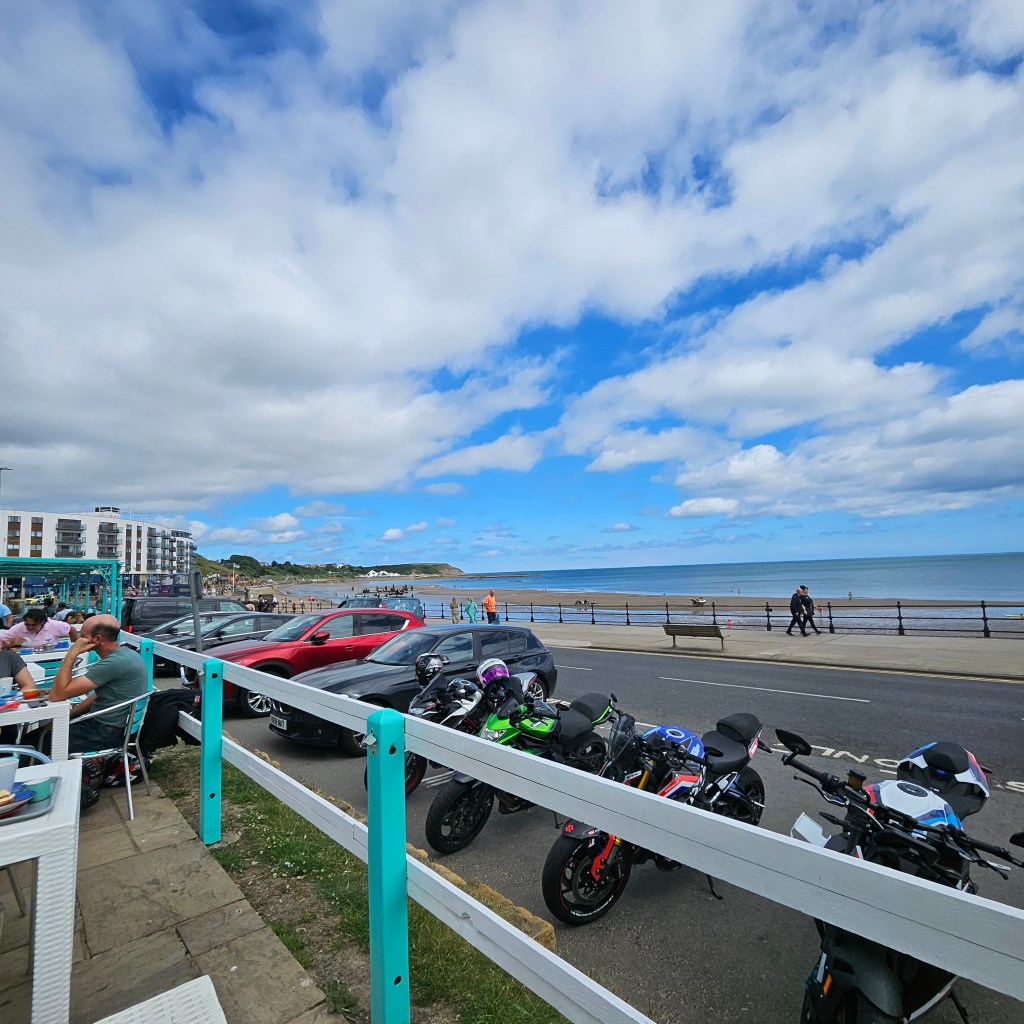 Halbzeitpause ist bei Scarborough. Wir gönnen uns ein Kaltgetränk in einem Strandcafé bei bestem Sonnenwetter. Es ist super windig, aber die Wolkendecke lässt die Sonne durch und ist ausnahmsweise mal nicht am Regnen.