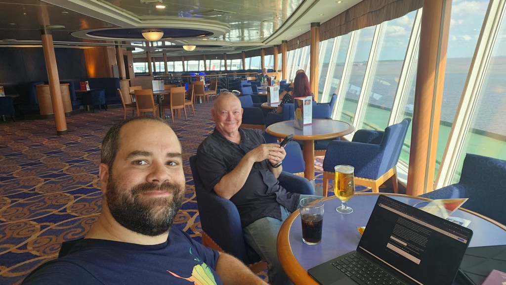 In der Kabine angekommen, sieht Gü aus, als habe er geduscht, so nass ist er. Ich gehe schonmal vor in die Sky Lounge und überlasse Gü den Tanzsaal, aka Kabine.