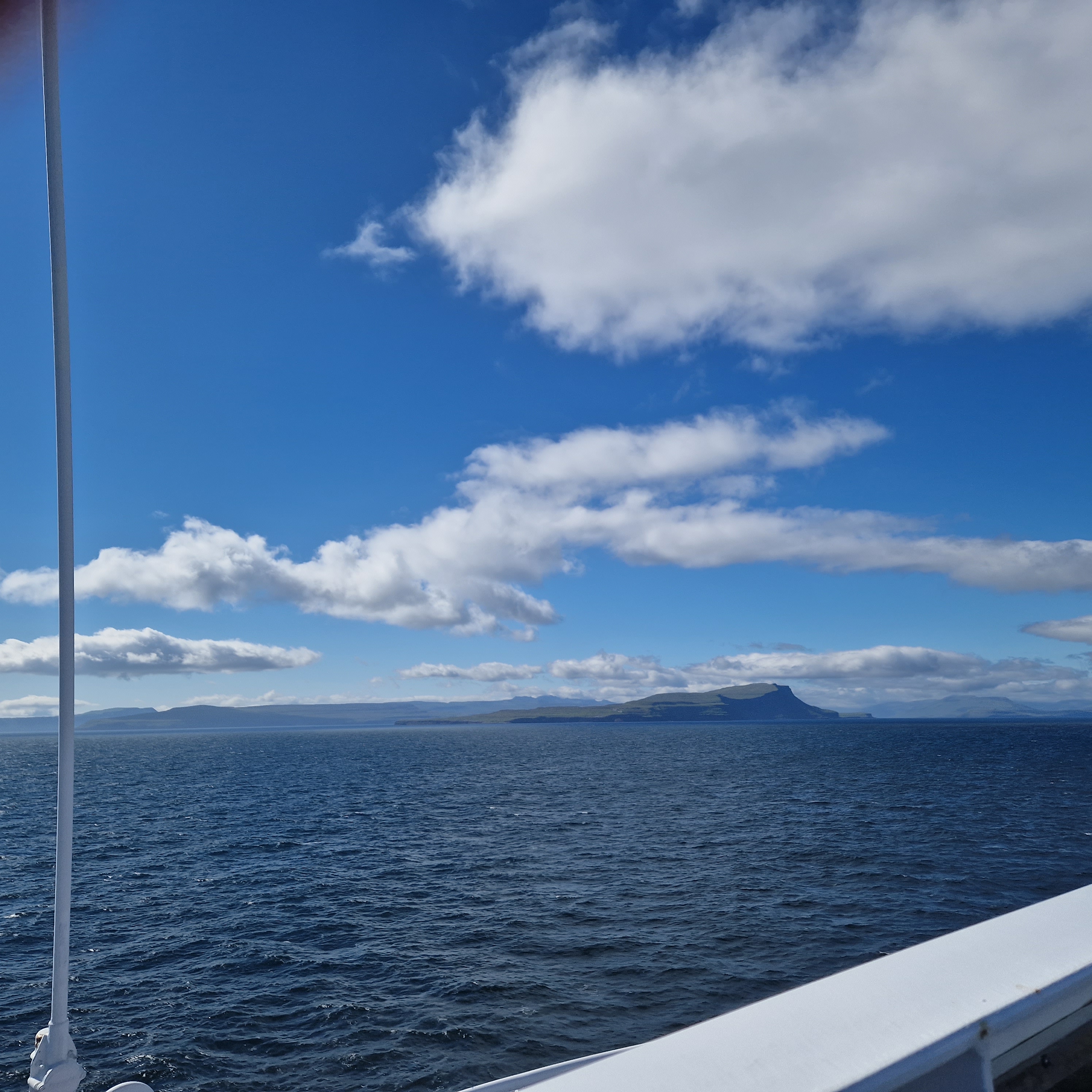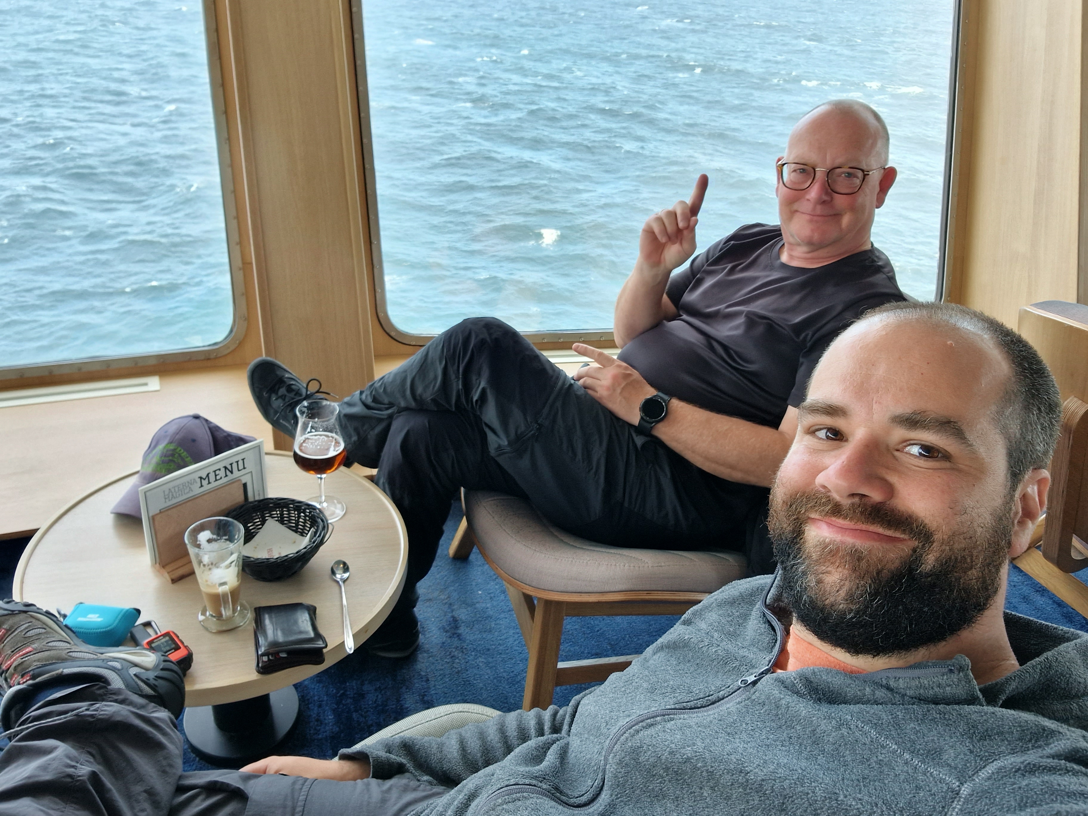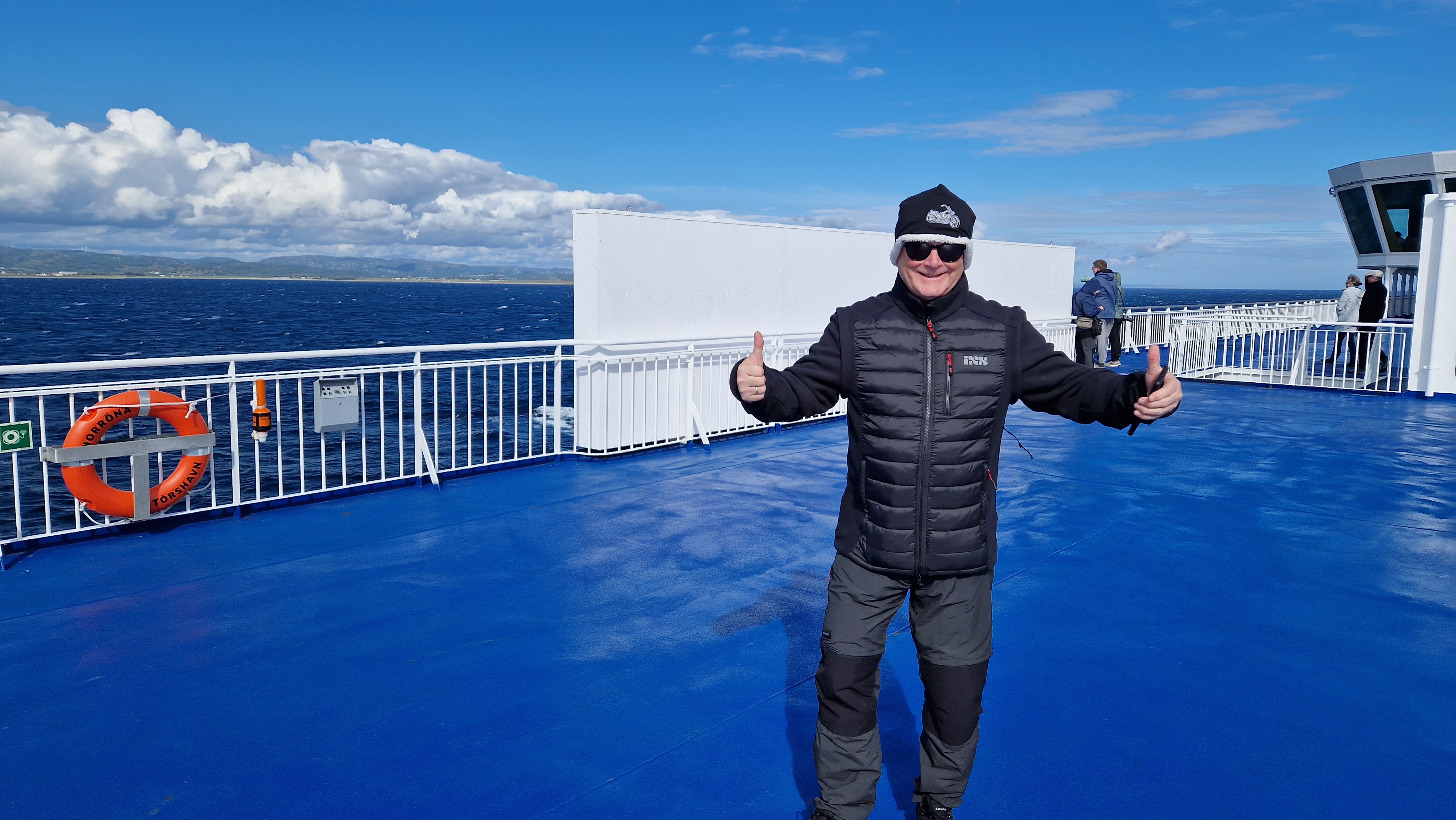 Kurz zusammen gepackt, noch beim Bäcker gefrühstückt und dann zur Fähre. Nach ein paar kurzen Regenschauern beim Warten und anstehen sind wir jetzt an Board…
